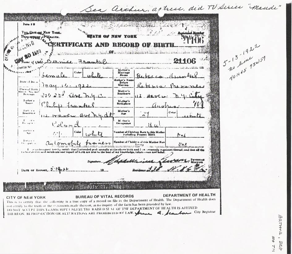 That being said, there is one HUGE issue among all written and produced biographies, news reports and random articles about Bea Arthur. Her age. I believed for years via my own research that she was born May 13, 1923. However, recently, I have had access to more reliable sources in which the belief is that Bea was born in 1922. This will make Bea's age, as of May 13, 2007, 85. In the article below, her birth date is listed as 1926, but that is definitely incorrect. The debate is 1923 or 1922. As of today, January 25, 2007, I am changing her official birthday to 1922. Can you prove otherwise? Discuss.