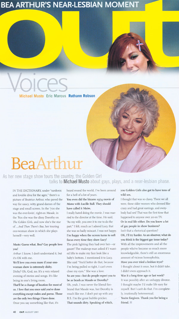 The following is from my scrapbook of clippings in no particular order. From the OUT magazine August 2001. Save the image to your hard drive to view it full size.