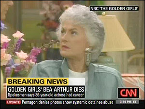 It's a shame that I have to start work on this sub-page to this web site, but it is something that has to be done and with great pride in the remembrance of a unique soul, Bea Arthur. Bea passed away Saturday, April 25, 2009 at the age of 86.